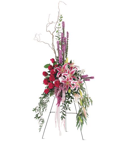 One standing easel spray arrives filled with red roses, purple liatris, stargazer lilies and a cluster of heather with cascading ribbon accents.
