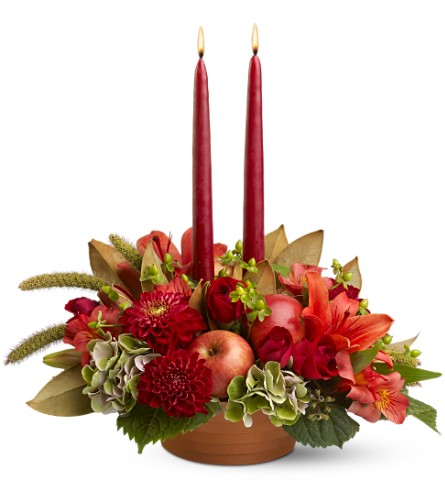 At twilight, a soft evening light settles over the fields, and there’s a hush in the garden. The subtle mix of this lovely harvest centerpiece includes red roses, lilies and dahlias, plus unique trimmings like real apples, dried millet and magnolia leaves. Two tall red tapers will cast a pretty light over the Thanksgiving feast or any festive occasion.