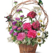 At twilight, a soft evening light settles over the fields, and there’s a hush in the garden. The subtle mix of this lovely harvest centerpiece includes red roses, lilies and dahlias, plus unique trimmings like real apples, dried millet and magnolia leaves. Two tall red tapers will cast a pretty light over the Thanksgiving feast or any festive occasion.