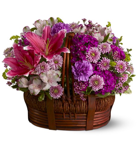 A mix of fresh pink, lavender and burgundy flowers such as Asiatic lilies, Sweet William, button spray chrysanthemums and waxflower accented with greenery is delivered in a woven basket.