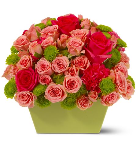 Hot pink roses and carnations, light pink spray roses and green button spray chrysanthemums are delivered in a square tapered palm bowl.