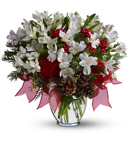 As fresh and pure as the first snowfall in an evergreen forest, this generous puff of white alstroemeria blossoms accented with pinecones, red berries and a scarlet ribbon is a delightful gift for the holidays. Send one to a friend, family member or business associate this season.