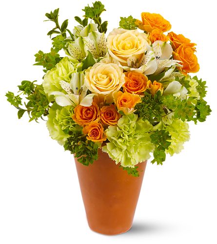 Peach roses, green carnations and white alstroemeria accented with bupleurum and oregonia are delivered in a clay pot.