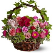 What could be more heavenly than this harvest display of fresh flowers – including sunflowers, roses and Asiatic lilies – spilling from a natural cornucopia? Wonderful for Thanksgiving, and a spectacular hostess gift.