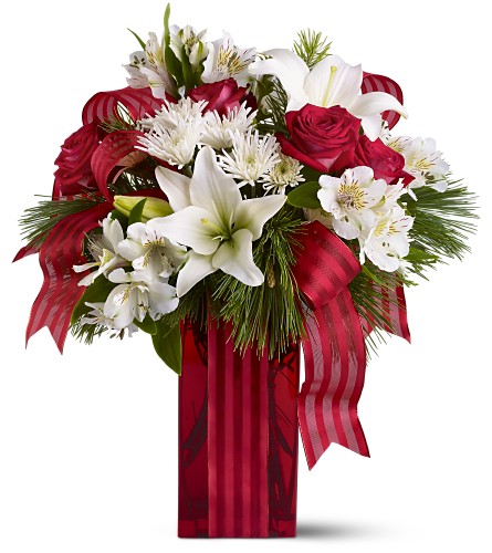 This festive mix of pure white blossoms, lush red roses and cool evergreens presented in a bold red vase and tied up with a red striped ribbon will be the life of any party. Let the holiday spirit move you. Send one today.