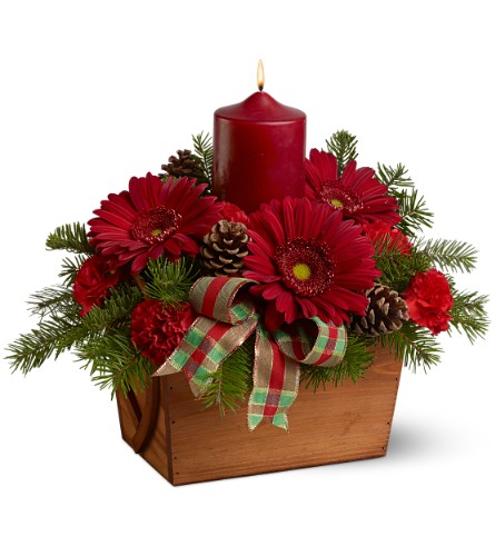 Invite your family home for the holidays with this rustic arrangement of red flowers, pinecones and evergreens around a pillar candle, delivered in a wooden box. A charming decoration for any informal gathering.