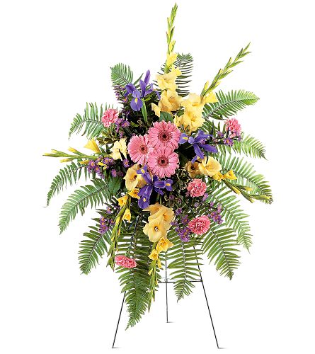 One spray of pink carnations, peach gerberas, yellow gladioli, blue iris and lavender Monte Cassino asters is delivered on an easel.