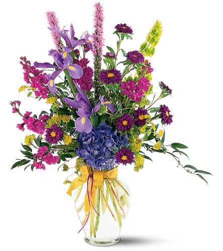 One arrangement arrives with purple liatris, asters and stock, blue iris and hydrangea in a clear glass vase.
