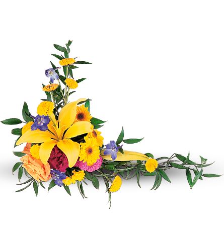 One corner cluster of fresh flowers is placed inside the casket and contains lilies, asters, chrysanthemums and roses to match the casket spray.