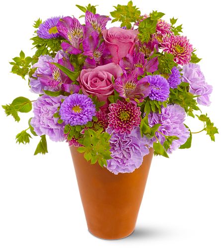 Purple Matsumoto asters and alstroemeria plus lavender roses, carnations and button spray chrysanthemums accented with bupleurum and oregonia are delivered in a clay pot.