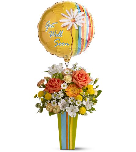 Has a friend been feeling under the weather? Send sunshine their way with a big, bright bouquet of yellow, white and orange flowers, arranged in a vase striped with ribbons and topped with a shiny “Get Well Soon” balloon. With a gift such as this, they??re sure to feel better.