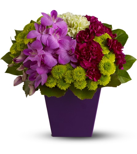 The elegant bouquet includes green button spray chrysanthemums, green carnations, lavender dendrobium orchids, burgundy carnations and miniature burgundy carnations accented with assorted greenery – delivered in a stylish vase.