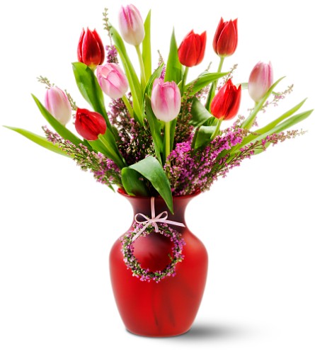 Pink and red tulips and heather are delivered in a red sweetheart vase, adorned with a pink satin ribbon.