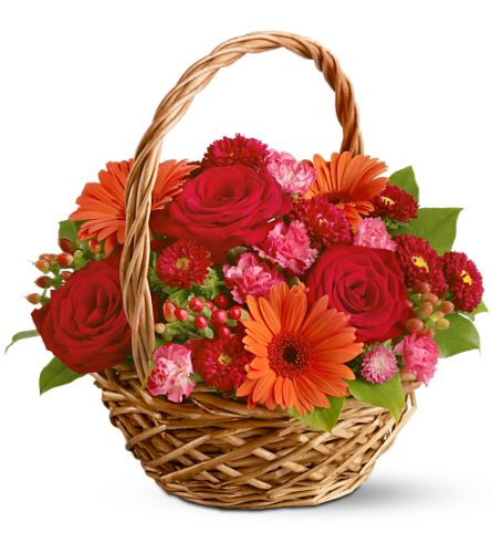 A tisket, a tasket… choose a basket full of blossoms in brilliant hues of red, pink and orange, and send warm wishes to someone special. This basket full of fiery blossoms is the perfect way to brighten someone??s day, and is just right for any occasion.