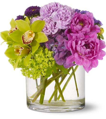 All the delicate tones of a watercolor painting, captured in an ethereal bouquet. Green orchids and purple dahlias mingle with lavender and chartreuse blooms to create a vision of pure beauty.